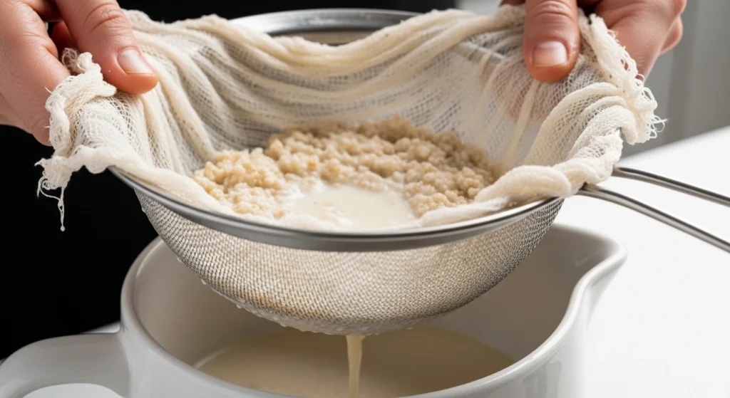 - Strain the Mixture: Line a fine-mesh sieve with cheesecloth. Place it over a large bowl and pour the blended rice mixture through it.