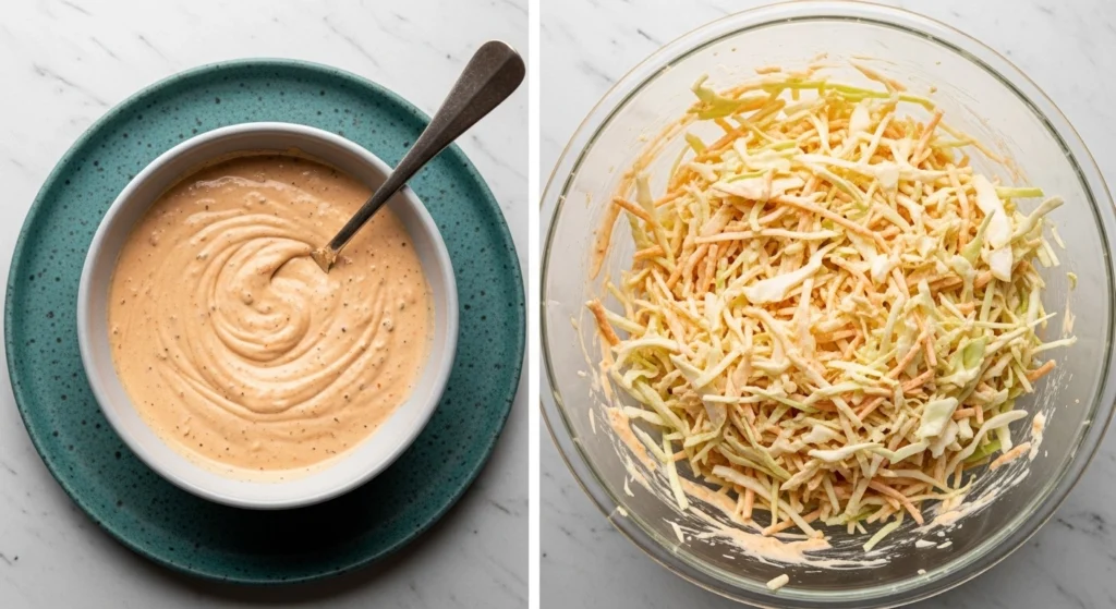 3.Whisk the Sauce: Mix your Greek yogurt, a splash of lime, and a pinch of salt to create your taco slaw with Greek yogurt base.