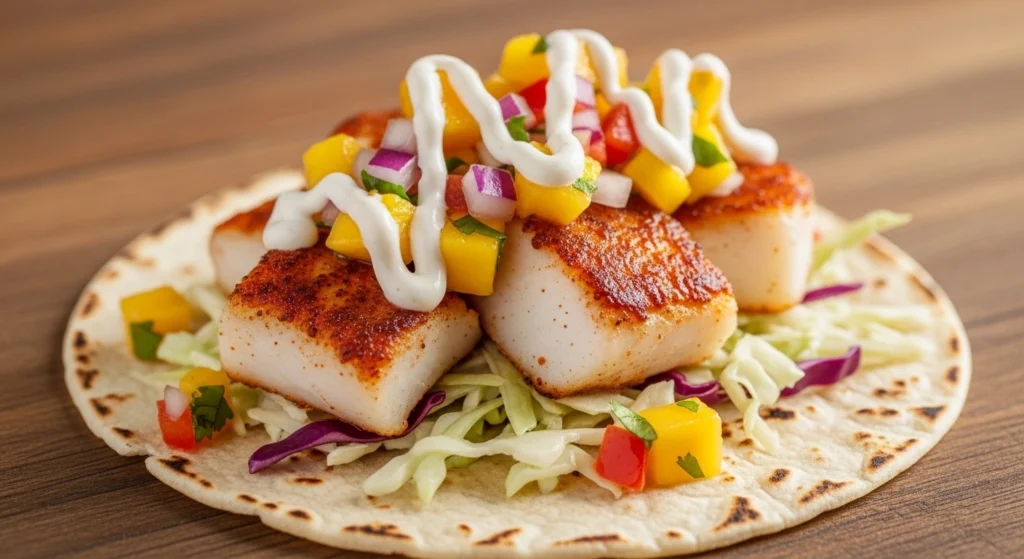 These Baja Fish Tacos with Mango Salsa are the ultimate fresh, 30-minute meal. Featuring pan-seared, taco-spiced white fish, a zesty taco slaw with Greek yogurt, and a vibrant, sweet-and-spicy mango salsa, they are a healthy and delicious alternative to deep-fried tacos. Perfect for a quick weeknight dinner or a breezy summer patio night!