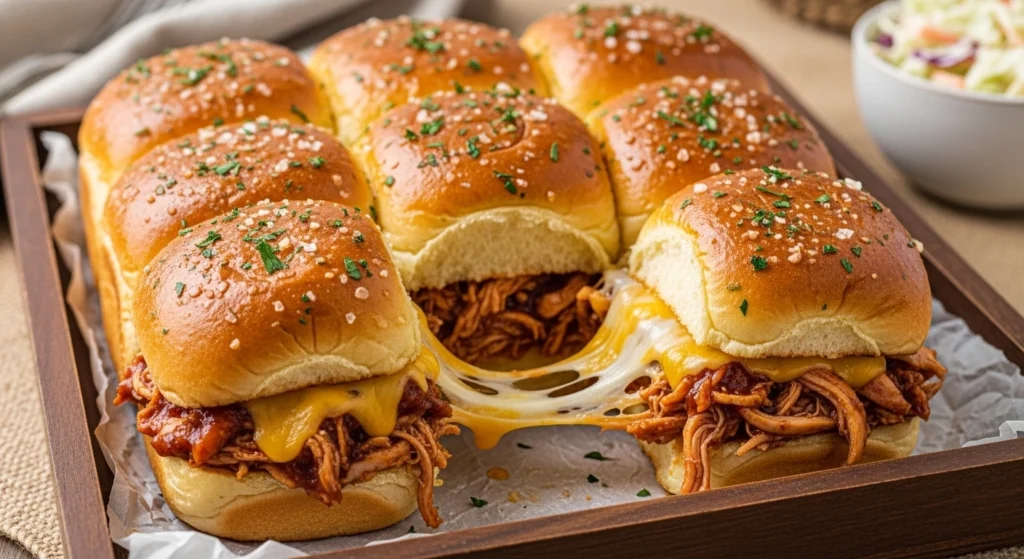 The ultimate game-day meal! Tender, slow-cooked pulled chicken smothered in sweet BBQ sauce, layered with melted cheese, and baked on fluffy Hawaiian rolls.