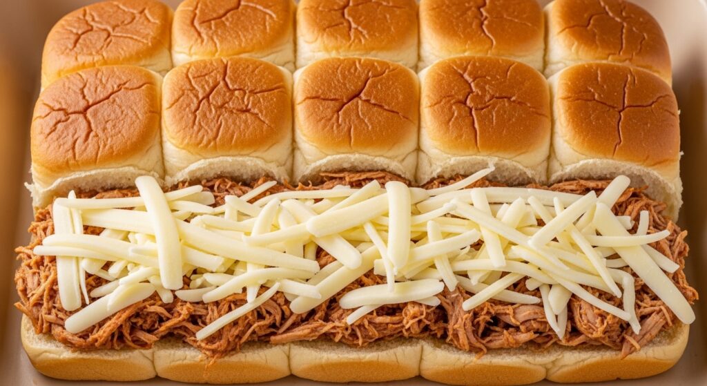 Step 7: Assemble the sliders. Spread your hot pulled chicken evenly over the bottom layer of rolls. Top the meat generously with your sliced or shredded cheese. Place the top layer of buns over the cheese.