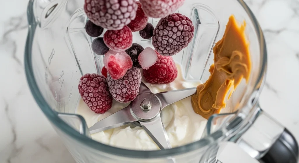 Step 2: Add liquids first. Pour your milk and Greek yogurt into the blender closest to the blades. This helps the blades catch and pull the frozen fruit down.