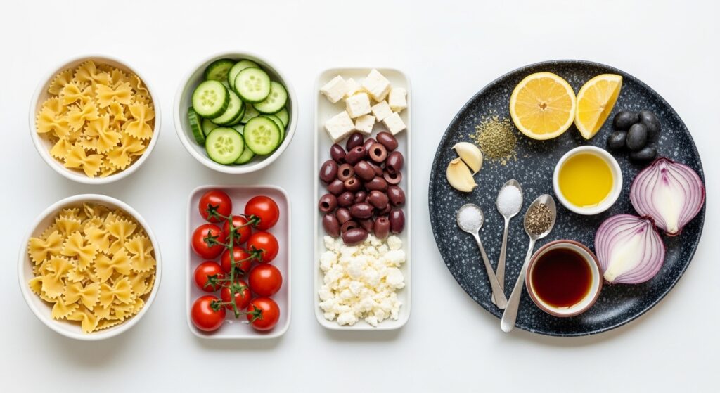 To create an authentic Greek Lemon Pasta Salad, gather these fresh staples: