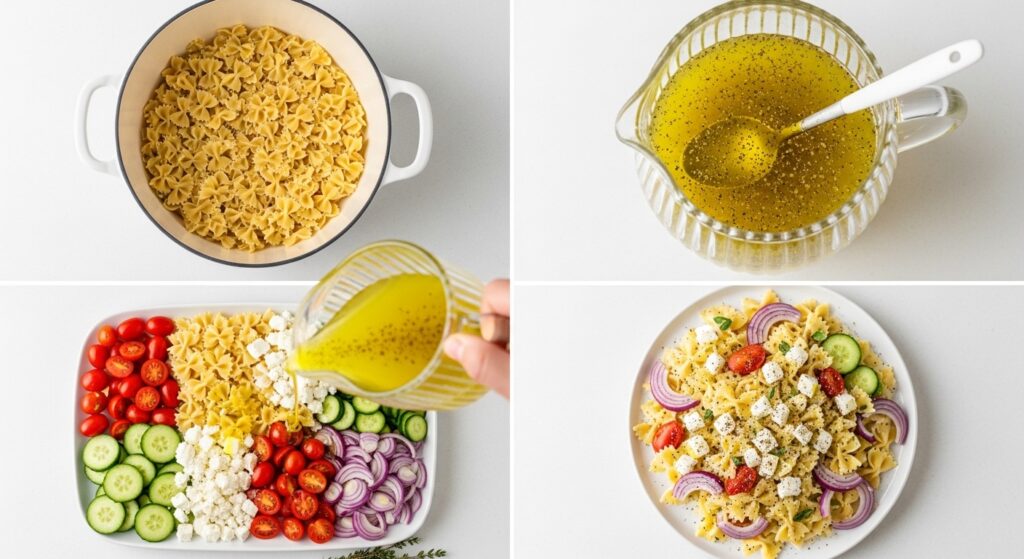 Maya’s Tip: Always rinse your pasta under cold water for 20-30 seconds after boiling. This stops the cooking process and prevents the noodles from sticking, ensuring your Greek Lemon Pasta Salad stays light and fresh.