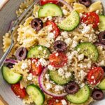 Should I rinse the pasta with cold water for this salad? Yes, rinsing for 20-30 seconds ensures the Greek Lemon Pasta Salad doesn’t become clumpy or mushy.