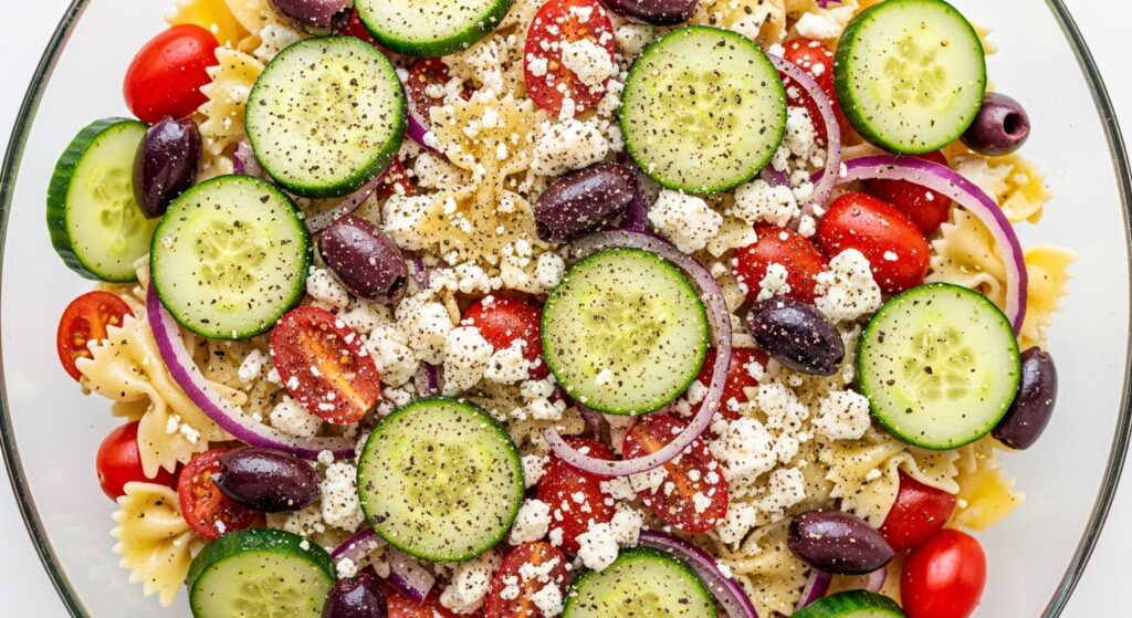 This Greek Lemon Pasta Salad is more than just a side; it’s a Mediterranean-inspired power bowl. The combination of al dente pasta, crisp English cucumbers, and salty Kalamata olives creates a texture profile that never gets boring.