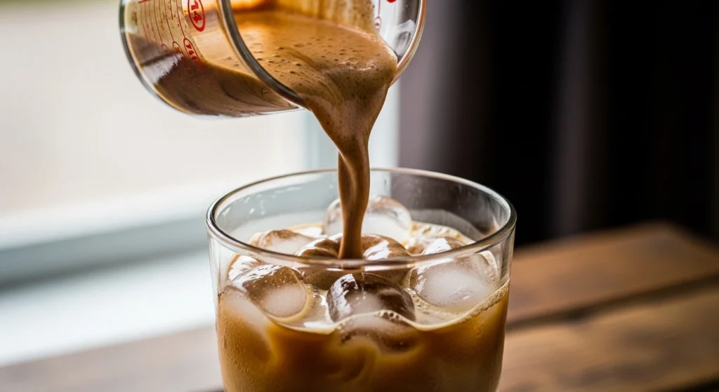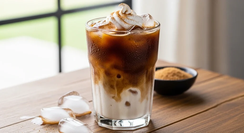 • Add Ingredients: Pour the hot espresso over the ice. Add 1 to 2 tablespoons of your cooled brown sugar syrup and the ground cinnamon.