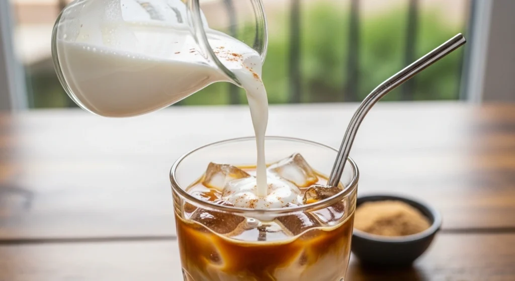 For that true coffee shop texture, you want to use a “barista blend” oat milk (like Oatly Barista Edition). Barista blends are formulated with slightly more fat, which creates a creamier mouthfeel, froths beautifully, and prevents the milk from separating or curdling when it hits the acidic coffee.