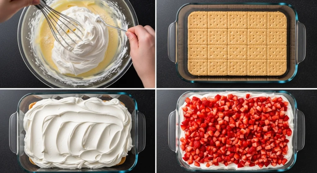 - Repeat: Continue layering—crackers, cream, strawberries—until you have three full layers.