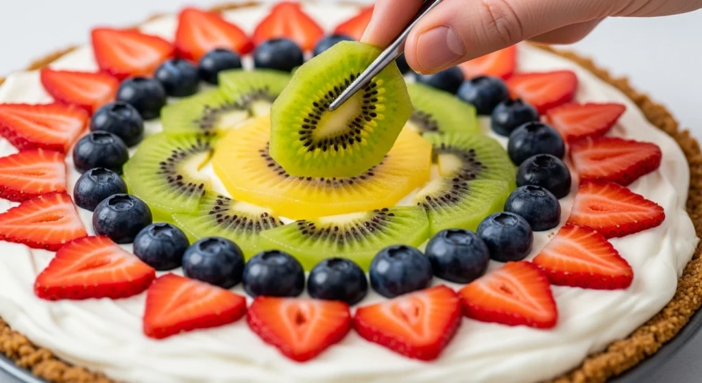 Decorate & Chill: Arrange your sliced fresh fruit in a decorative pattern over the frosting. Chill the fruit pizza in the refrigerator for at least 30 minutes before slicing into wedges and serving.