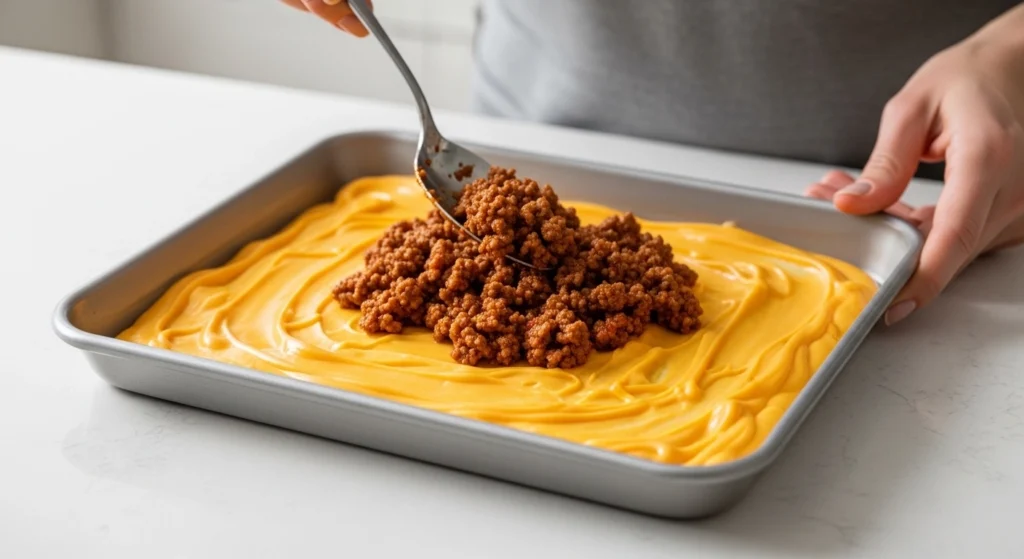 - Layer the Meat: Evenly distribute your cooked ground beef mixture right on top of the liquid nacho cheese layer.
