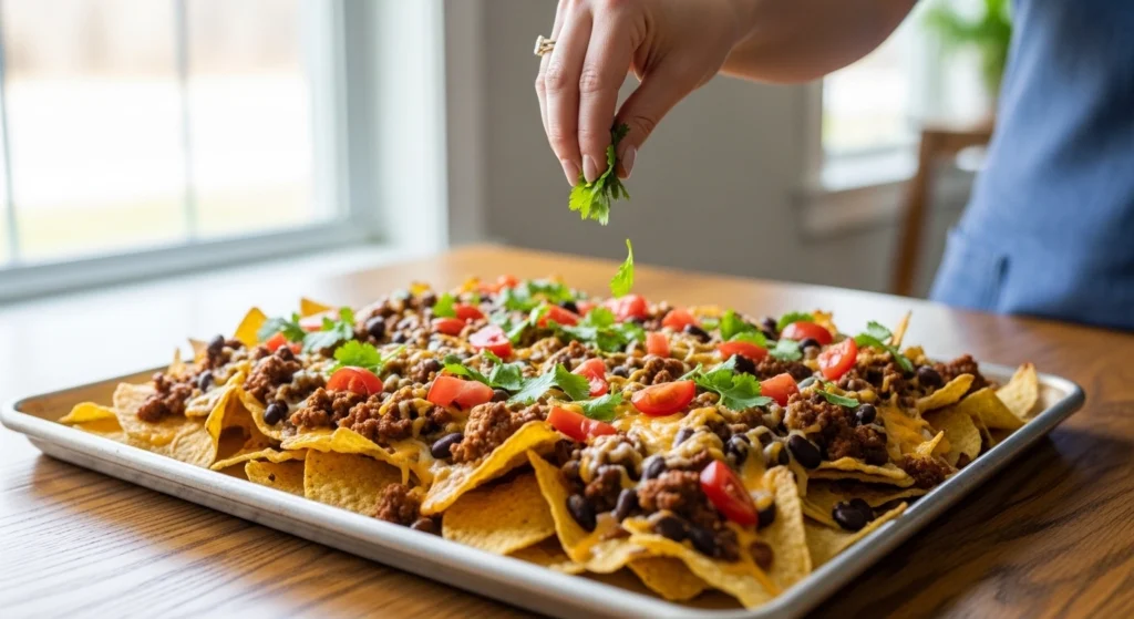 The Slide: Remove the hot tray from the oven. Hold it at a slight angle over the chips and use a spatula to gently slide the hot cheese and beef mixture directly onto the chips.