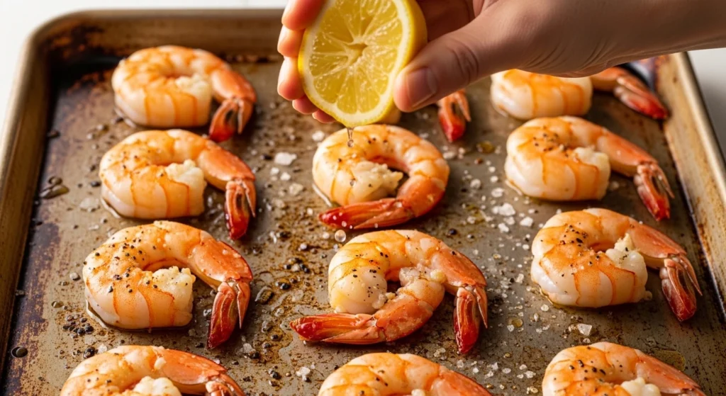 3. Squeeze the Lemon As soon as the shrimp come out of the oven, squeeze the juice of one lemon directly over them. Set aside.