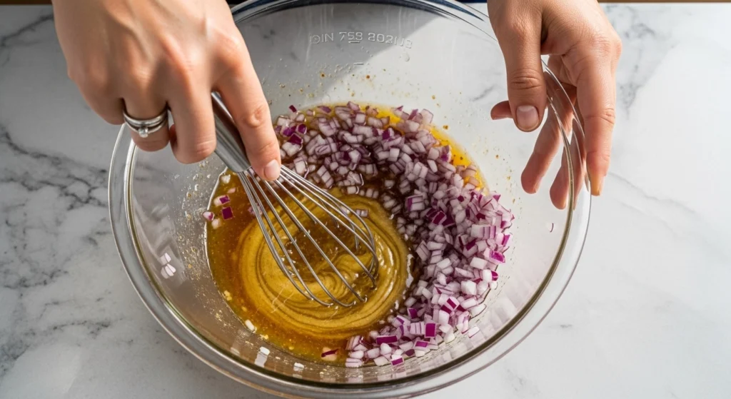Marinate Onions: Stir the finely chopped red onions into the dressing bowl. Set aside so the onions can mellow.