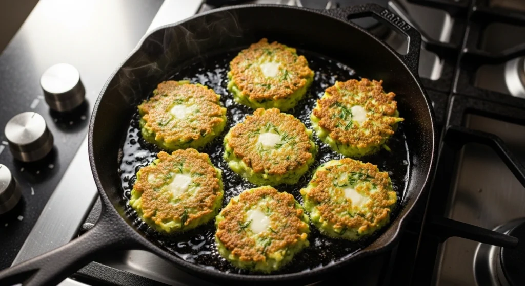 Fry: Drop 2-tablespoon portions of batter into the hot oil, flattening slightly. Fry for 3-4 minutes per side until deeply golden and crispy.